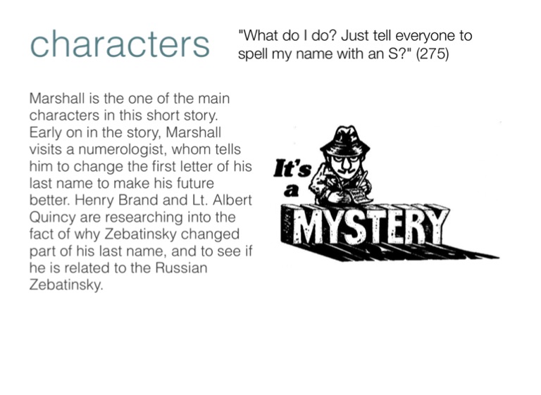 Marshall is the one of the main characters in this short story. Early on in the story, Marshall visits a numerologist, whom tells him to change the first letter of his last name to make his future better. Henry Brand and Lt. Albert Quincy are researching into the fact of why Zebatinsky changed part of his last name, and to see if he is related to the Russian Zebatinsky.