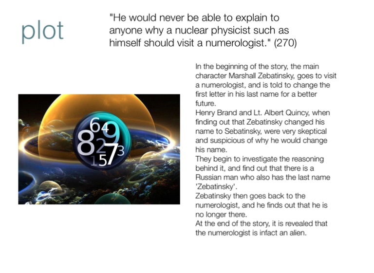In the beginning of the story, the main character Marshall Zebatinsky, goes to visit a numerologist, and is told to change the first letter in his last name for a better future.
