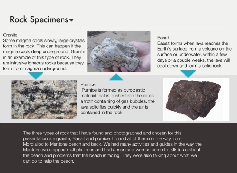 The three types of rock that I have found and photographed and chosen for this presentation are granite, Basalt and pumice. I found all of them on the way from Mordialloc to Mentone beach and back. We had many activities and guides in the way the Mentone we stopped multiple times and had a man and woman come to talk to us about the beach and problems that the beach is facing. They were also talking about what we can do to help the beach.