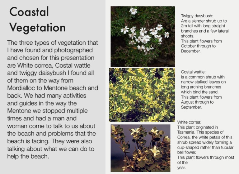 The three types of vegetation that I have found and photographed and chosen for this presentation are White correa, Costal wattle and twiggy daisybush I found all of them on the way from Mordialloc to Mentone beach and back. We had many activities and guides in the way the Mentone we stopped multiple times and had a man and woman come to talk to us about the beach and problems that the beach is facing. They were also talking about what we can do to help the beach.