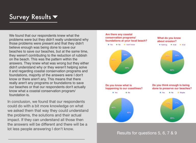We found that our respondents knew what the problems were but they didn't really understand why those problems were present and that they didn't believe enough was being done to save our beaches to save our beaches, but at the same time, they weren't contributing to the reduction of rubbish on the beach. This was the pattern within the answers. They knew what was wrong but they either didn't understand why or they weren't helping solve it and regarding coastal conservation programs and foundations, majority of the answers were I don't know or there aren't any. This means that there really aren't any programs or foundations to save our beaches or that our respondents don't actually know what a coastal conservation program/foundation is.