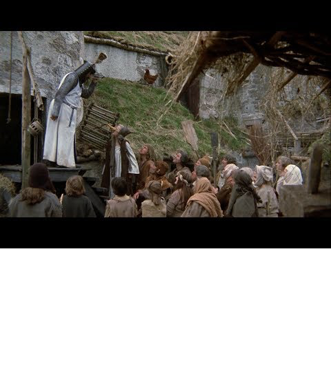 An example of parody is when the knights of the round table go and witness a witch hunt. The people, who were accusing her of being a witch, actually just dressed her up to look like a witch with odd clothes and a carrot for a nose. This is parody because the writer of Monty Python was imitating and mocking the practices during the Salem Witch trials