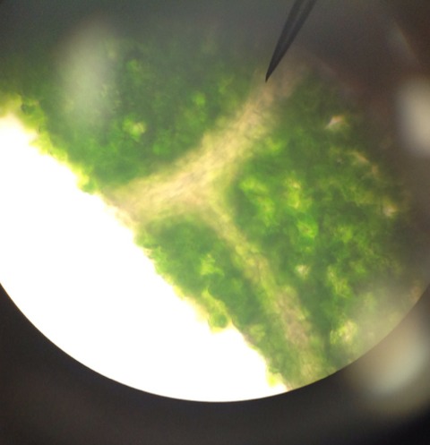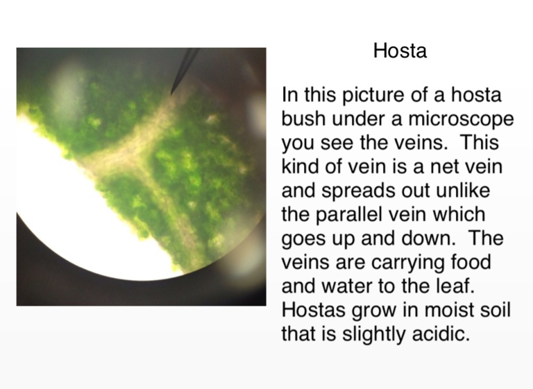 In this picture of a hosta bush under a microscope you see the veins. This kind of vein is a net vein and spreads out unlike the parallel vein which goes up and down. The veins are carrying food and water to the leaf.