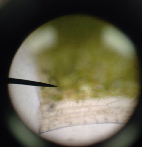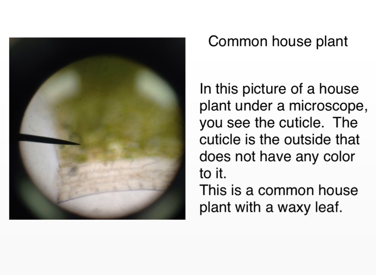 In this picture of a house plant under a microscope, you see the cuticle. The cuticle is the outside that does not have any color to it.