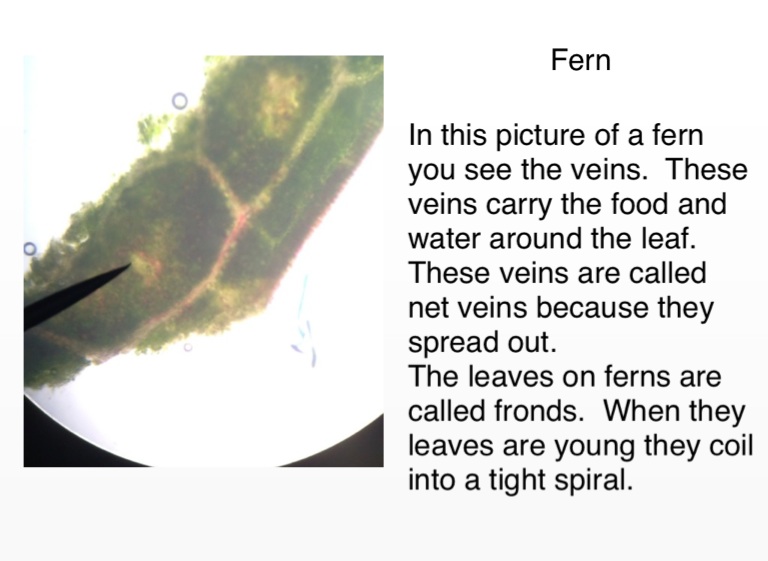 In this picture of a fern you see the veins. These veins carry the food and water around the leaf. These veins are called net veins because they spread out.