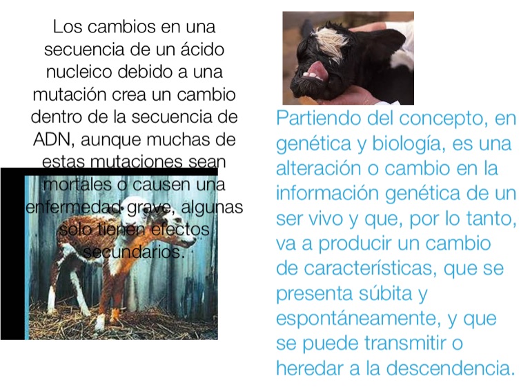 Partiendo del concepto, en genética y biología, es una alteración o cambio en la información genética de un ser vivo y que, por lo tanto, va a producir un cambio de características, que se presenta súbita y espontáneamente, y que se puede transmitir o heredar a la descendencia.