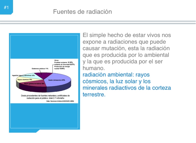 El simple hecho de estar vivos nos expone a radiaciones que puede causar mutación, esta la radiación que es producida por lo ambiental y la que es producida por el ser humano.