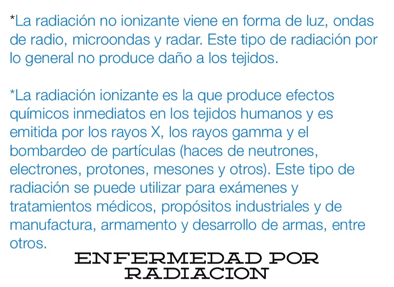 *La radiación ionizante es la que produce efectos químicos inmediatos en los tejidos humanos y es emitida por los rayos X, los rayos gamma y el bombardeo de partículas (haces de neutrones, electrones, protones, mesones y otros). Este tipo de radiación se puede utilizar para exámenes y tratamientos médicos, propósitos industriales y de manufactura, armamento y desarrollo de armas, entre otros.