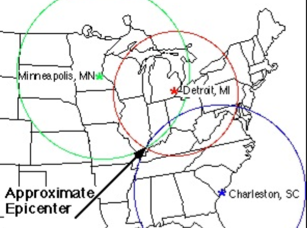 3.Using your compass, draw a circle with a radius equal to the number you came up with in Step #2 (the radius is the distance from the center of a circle to its edge). The center of the circle will be the location of your seismograph. The epicenter of the earthquake is somewhere on the edge of that circle.