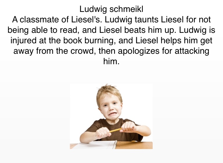 A classmate of Liesel's. Ludwig taunts Liesel for not being able to read, and Liesel beats him up. Ludwig is injured at the book burning, and Liesel helps him get away from the crowd, then apologizes for attacking him.