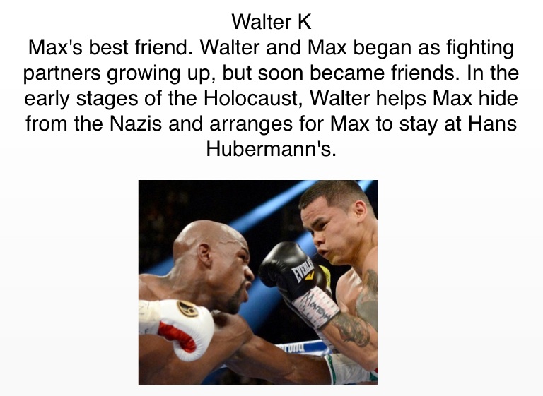 Max's best friend. Walter and Max began as fighting partners growing up, but soon became friends. In the early stages of the Holocaust, Walter helps Max hide from the Nazis and arranges for Max to stay at Hans Hubermann's.