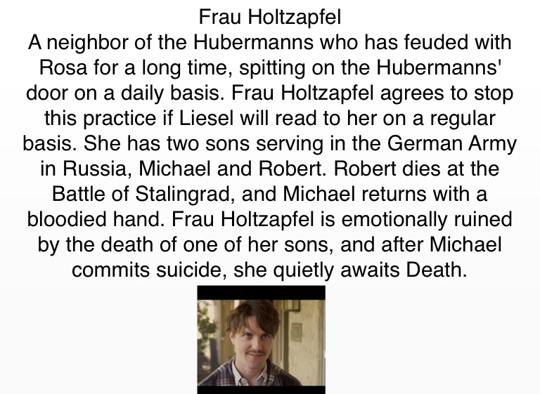 A neighbor of the Hubermanns who has feuded with Rosa for a long time, spitting on the Hubermanns' door on a daily basis. Frau Holtzapfel agrees to stop this practice if Liesel will read to her on a regular basis. She has two sons serving in the German Army in Russia, Michael and Robert. Robert dies at the Battle of Stalingrad, and Michael returns with a bloodied hand. Frau Holtzapfel is emotionally ruined by the death of one of her sons, and after Michael commits suicide, she quietly awaits Death.