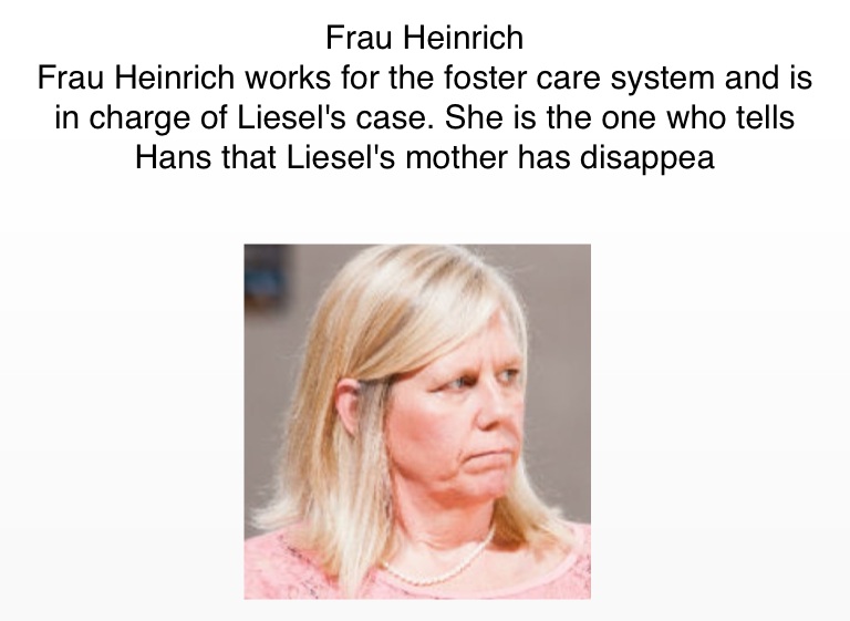 Frau Heinrich works for the foster care system and is in charge of Liesel's case. She is the one who tells Hans that Liesel's mother has disappea