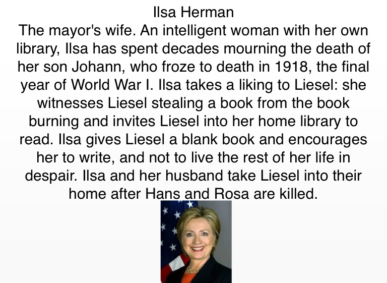 The mayor's wife. An intelligent woman with her own library, Ilsa has spent decades mourning the death of her son Johann, who froze to death in 1918, the final year of World War I. Ilsa takes a liking to Liesel: she witnesses Liesel stealing a book from the book burning and invites Liesel into her home library to read. Ilsa gives Liesel a blank book and encourages her to write, and not to live the rest of her life in despair. Ilsa and her husband take Liesel into their home after Hans and Rosa are killed.