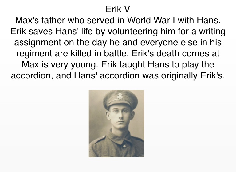 Max's father who served in World War I with Hans. Erik saves Hans' life by volunteering him for a writing assignment on the day he and everyone else in his regiment are killed in battle. Erik's death comes at Max is very young. Erik taught Hans to play the accordion, and Hans' accordion was originally Erik's.