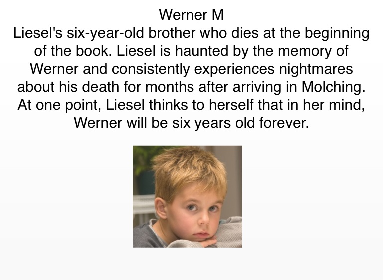 Liesel's six-year-old brother who dies at the beginning of the book. Liesel is haunted by the memory of Werner and consistently experiences nightmares about his death for months after arriving in Molching. At one point, Liesel thinks to herself that in her mind, Werner will be six years old forever.