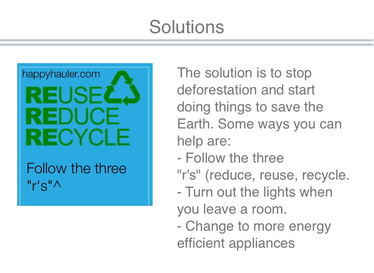 The solution is to stop deforestation and start doing things to save the Earth. Some ways you can help are: