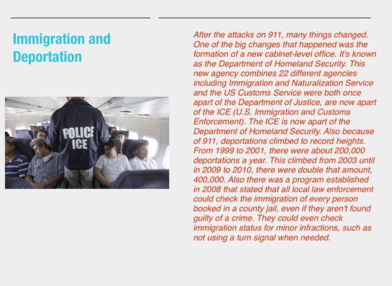 After the attacks on 911, many things changed. One of the big changes that happened was the formation of a new cabinet-level office. It's known as the Department of Homeland Security. This new agency combines 22 different agencies including Immigration and Naturalization Service and the US Customs Service were both once apart of the Department of Justice, are now apart of the ICE (U.S. Immigration and Customs Enforcement). The ICE is now apart of the Department of Homeland Security. Also because of 911, deportations climbed to record heights. From 1999 to 2001, there were about 200,000 deportations a year. This climbed from 2003 until in 2009 to 2010, there were double that amount, 400,000. Also there was a program established in 2008 that stated that all local law enforcement could check the immigration of every person booked in a county jail, even if they aren't found guilty of a crime. They could even check immigration status for minor infractions, such as not using a turn signal when needed.