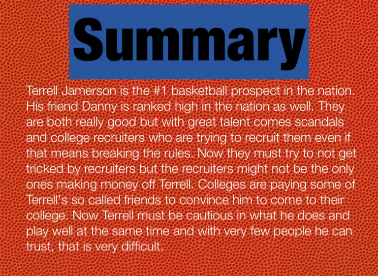 Terrell Jamerson is the #1 basketball prospect in the nation. His friend Danny is ranked high in the nation as well. They are both really good but with great talent comes scandals and college recruiters who are trying to recruit them even if that means breaking the rules. Now they must try to not get tricked by recruiters but the recruiters might not be the only ones making money off Terrell. Colleges are paying some of Terrell's so called friends to convince him to come to their college. Now Terrell must be cautious in what he does and play well at the same time and with very few people he can trust, that is very difficult.
