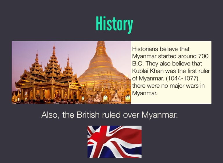 Historians believe that Myanmar started around 700 B.C. They also believe that Kublai Khan was the first ruler of Myanmar. (1044-1077) there were no major wars in Myanmar.