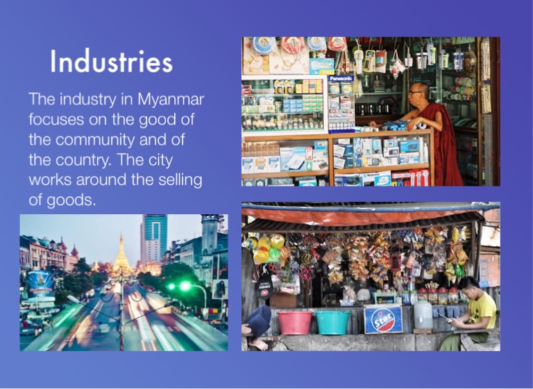 The industry in Myanmar focuses on the good of the community and of the country. The city works around the selling of goods.