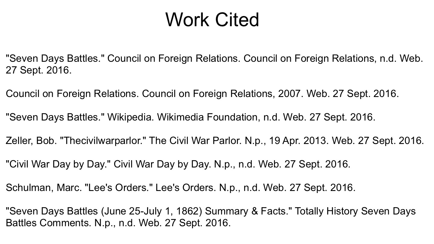 "Seven Days Battles (June 25-July 1, 1862) Summary & Facts." Totally History Seven Days Battles Comments. N.p., n.d. Web. 27 Sept. 2016.