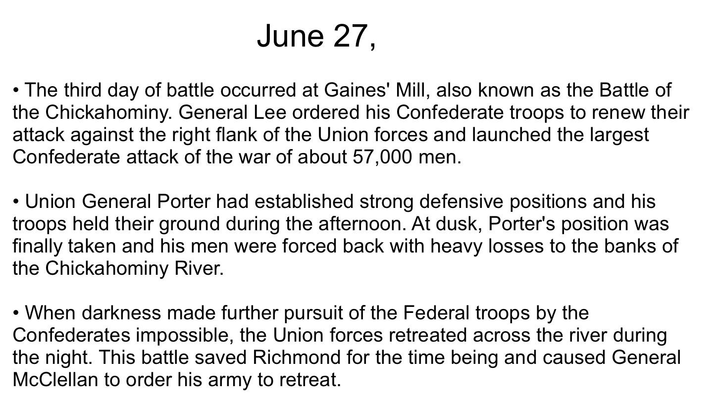 • Union General Porter had established strong defensive positions and his troops held their ground during the afternoon. At dusk, Porter's position was finally taken and his men were forced back with heavy losses to the banks of the Chickahominy River.