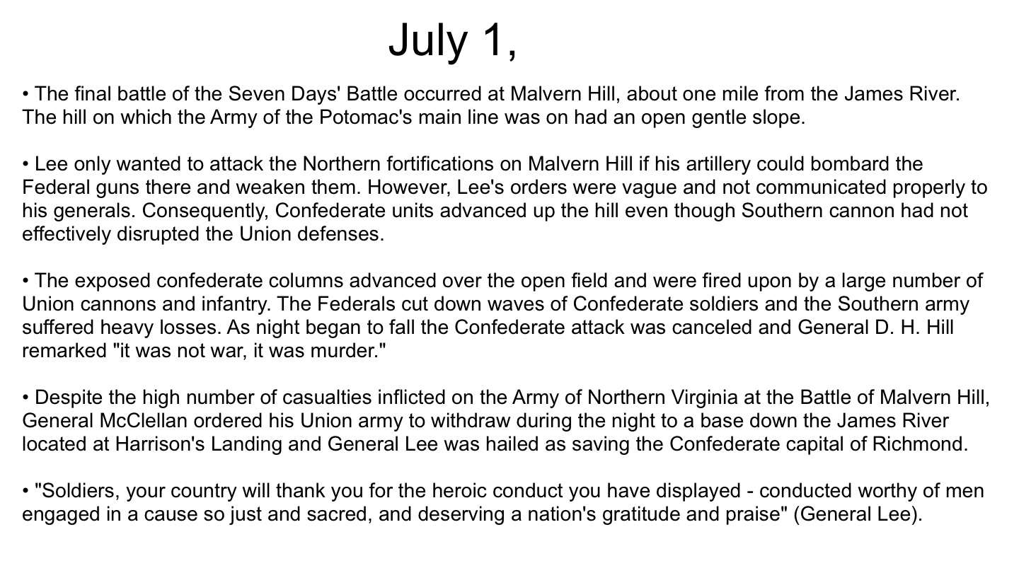 • Despite the high number of casualties inflicted on the Army of Northern Virginia at the Battle of Malvern Hill, General McClellan ordered his Union army to withdraw during the night to a base down the James River located at Harrison's Landing and General Lee was hailed as saving the Confederate capital of Richmond.