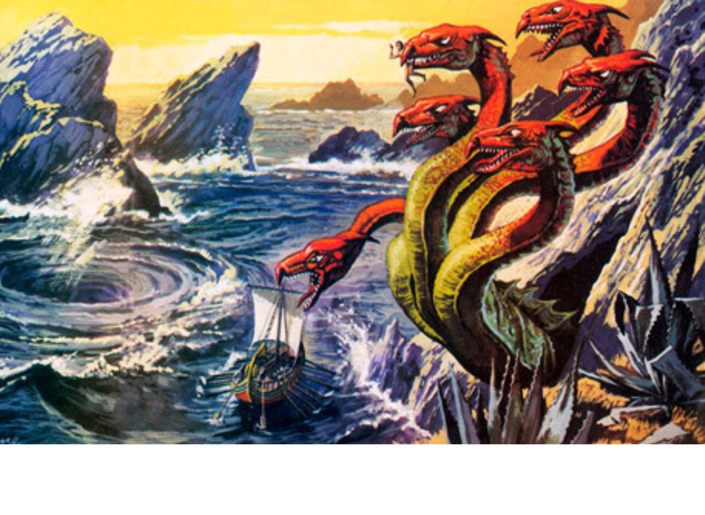 'Next came Charybdis, who swallows the sea in a whirlpool, then spits it up again. Avoiding this we skirted the cliff where Scylla exacts her toll. Each of her six slavering maws grabbed a sailor and wolfed him down.'