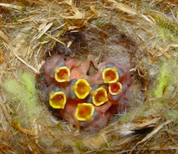 The chicks of most birds stay in the nest when they are born and are feed by their parents.