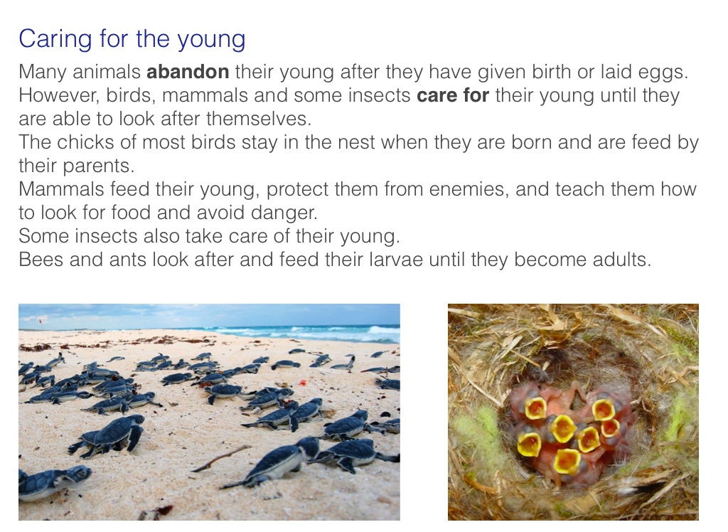Many animals abandon their young after they have given birth or laid eggs. However, birds, mammals and some insects care for their young until they are able to look after themselves.