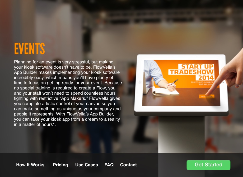 Planning for an event is very stressful, but making your kiosk software doesn’t have to be. FlowVella’s App Builder makes implementing your kiosk software incredibly easy, which means you’ll have plenty of time to focus on getting ready for your event. Because no special training is required to create a Flow, you and your staff won’t need to spend countless hours fighting with restrictive “App Makers.” FlowVella gives you complete artistic control of your canvas so you can make something as unique as your company and people it represents. With FlowVella’s App Builder, you can take your kiosk app from a dream to a reality in a matter of hours*.