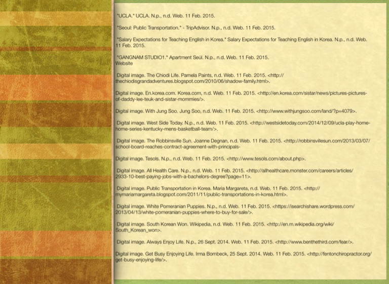 "Salary Expectations for Teaching English in Korea." Salary Expectations for Teaching English in Korea. N.p., n.d. Web. 11 Feb. 2015.