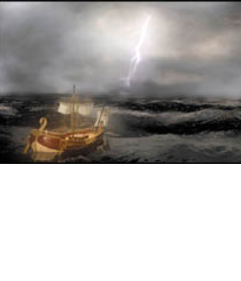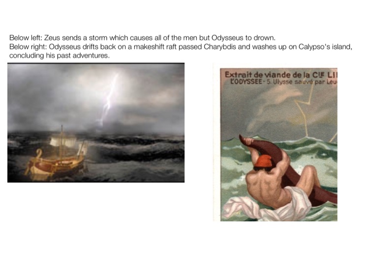 Below left: Zeus sends a storm which causes all of the men but Odysseus to drown.