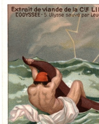 Below right: Odysseus drifts back on a makeshift raft passed Charybdis and washes up on Calypso's island, concluding his past adventures.