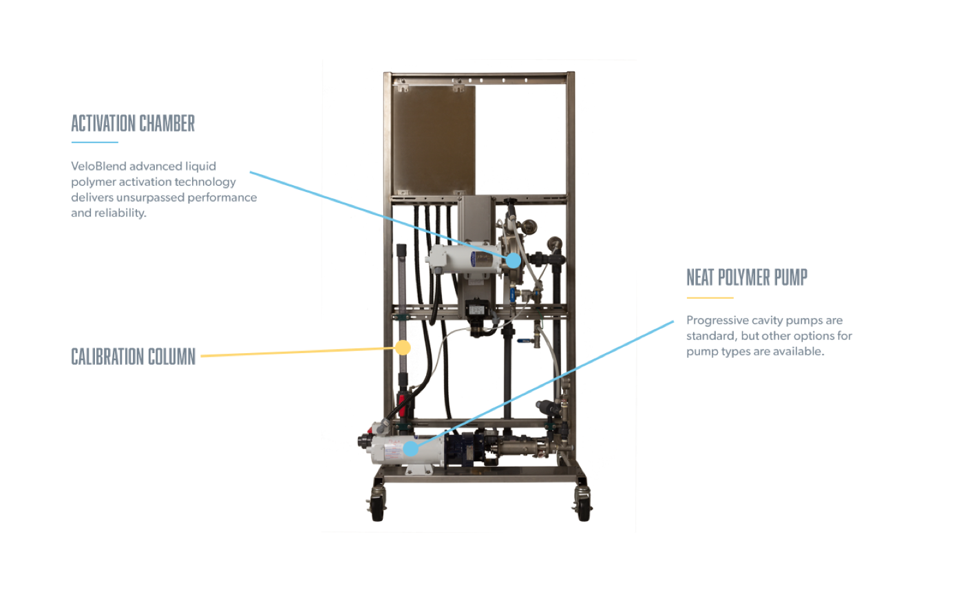 Skid 4 configuration. Progressive cavity pump, 4.5 to 360 GPH neat polymer, 30 to 600 GPM solution. Control level Db and Rw.