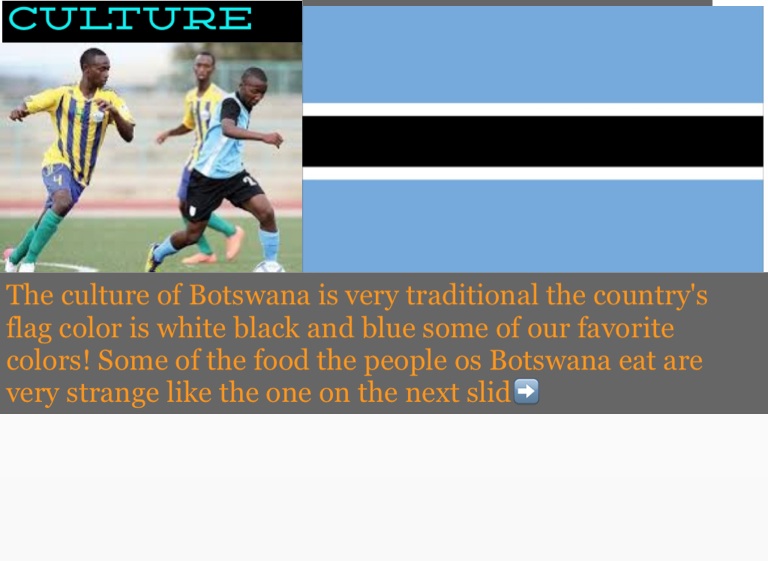 The culture of Botswana is very traditional the country's flag color is white black and blue some of our favorite colors! Some of the food the people os Botswana eat are very strange like the one on the next slid➡️