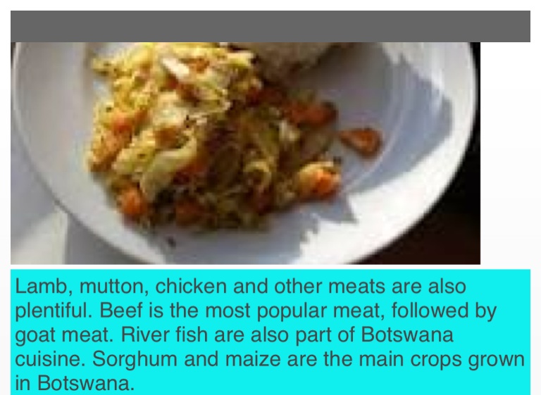Lamb, mutton, chicken and other meats are also plentiful. Beef is the most popular meat, followed by goat meat. River fish are also part of Botswana cuisine. Sorghum and maize are the main crops grown in Botswana.