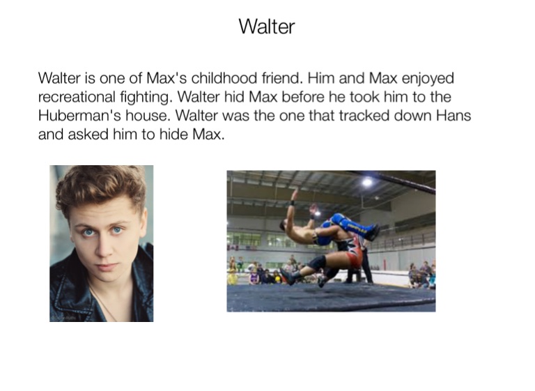 Walter is one of Max's childhood friend. Him and Max enjoyed recreational fighting. Walter hid Max before he took him to the Huberman's house. Walter was the one that tracked down Hans and asked him to hide Max.