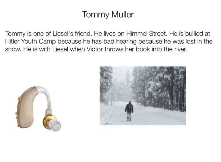 Tommy is one of Liesel's friend. He lives on Himmel Street. He is bullied at Hitler Youth Camp because he has bad hearing because he was lost in the snow. He is with Liesel when Victor throws her book into the river.