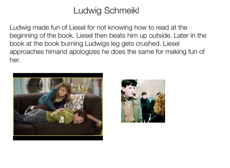 Ludwig made fun of Liesel for not knowing how to read at the beginning of the book. Liesel then beats him up outside. Later in the book at the book burning Ludwigs leg gets crushed. Liesel approaches himand apologizes he does the same for making fun of her.