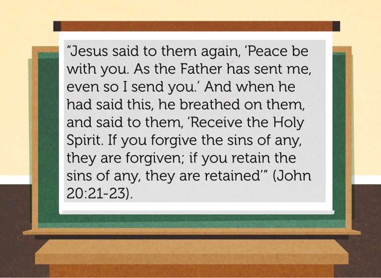 “Jesus said to them again, ‘Peace be with you. As the Father has sent me, even so I send you.’ And when he had said this, he breathed on them, and said to them, ‘Receive the Holy Spirit. If you forgive the sins of any, they are forgiven; if you retain the sins of any, they are retained’” (John 20:21-23).