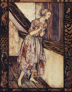 The story is very different from the Disney version but starts out similar with a widowed husband and the lonely stepdaughter, Aschenputtel. The ball is instead held for 3 nights and the stepmother distracts her from going by throwing lentils in the ashes and telling her to pick them out. The first night of the festival where she dances with the prince, she wears white. She then follows wearing silver and gold. The step daughters chop off their heels and toes to fit the shoe but Aschenputtel finally gets her prince and at the wedding the stepdaughters eyes are permanently pecked out by birds