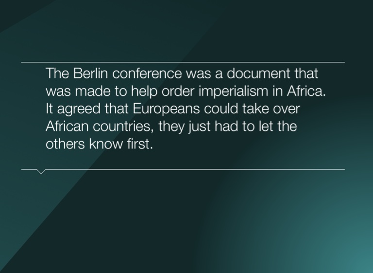 The Berlin conference was a document that was made to help order imperialism in Africa. It agreed that Europeans could take over African countries, they just had to let the others know first.