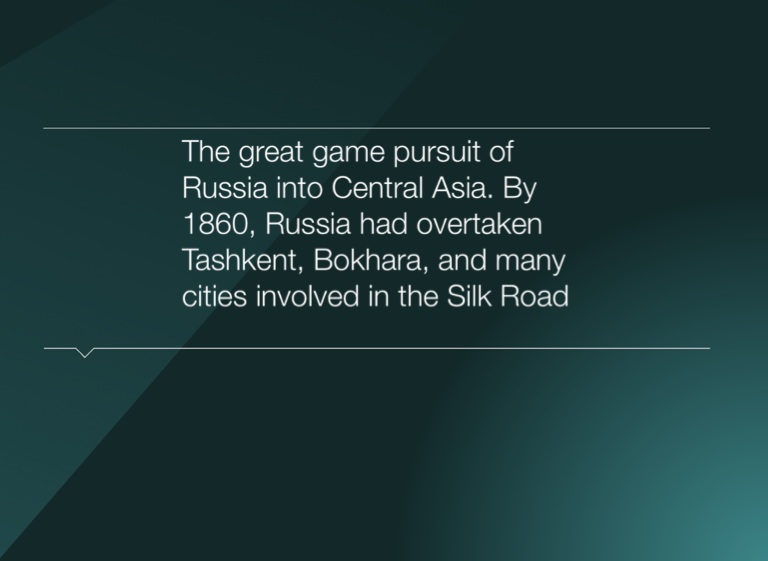 The great game pursuit of Russia into Central Asia. By 1860, Russia had overtaken Tashkent, Bokhara, and many cities involved in the Silk Road
