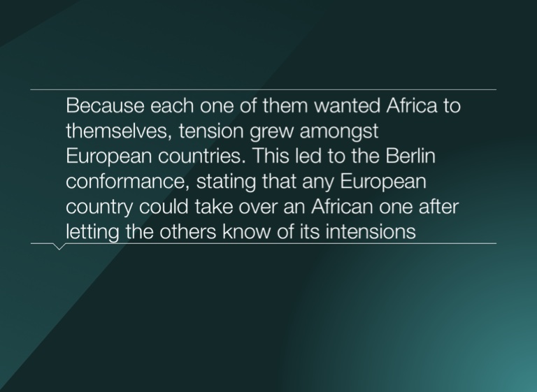 Because each one of them wanted Africa to themselves, tension grew amongst European countries. This led to the Berlin conformance, stating that any European country could take over an African one after letting the others know of its intensions