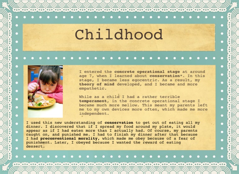 I entered the concrete operational stage at around age 7, when I learned about conservation*. In this stage, I became less egocentric. As a result, my theory of mind developed, and I became and more empathetic.