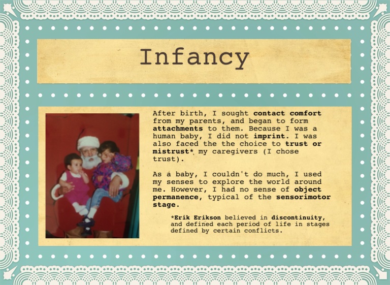 After birth, I sought contact comfort from my parents, and began to form attachments to them. Because I was a human baby, I did not imprint. I was also faced the the choice to trust or mistrust* my caregivers (I chose trust).