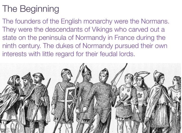 The founders of the English monarchy were the Normans. They were the descendants of Vikings who carved out a state on the peninsula of Normandy in France during the ninth century. The dukes of Normandy pursued their own interests with little regard for their feudal lords.