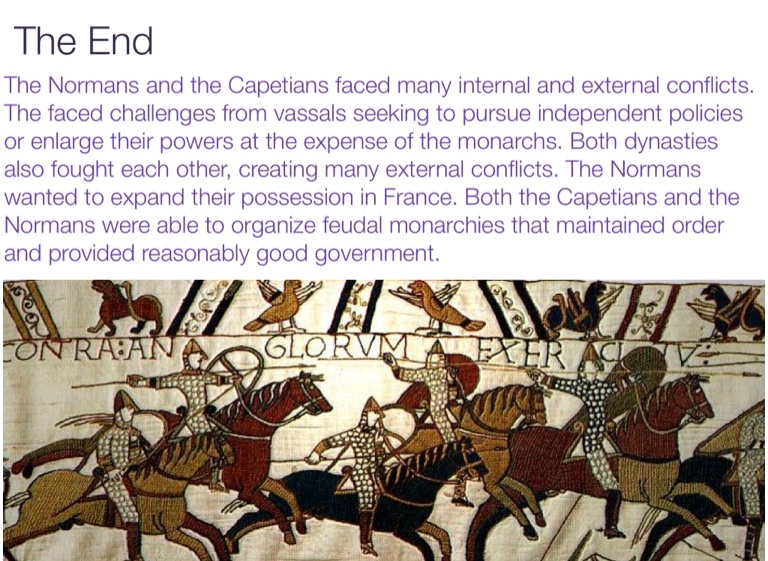 The Normans and the Capetians faced many internal and external conflicts. The faced challenges from vassals seeking to pursue independent policies or enlarge their powers at the expense of the monarchs. Both dynasties also fought each other, creating many external conflicts. The Normans wanted to expand their possession in France. Both the Capetians and the Normans were able to organize feudal monarchies that maintained order and provided reasonably good government.